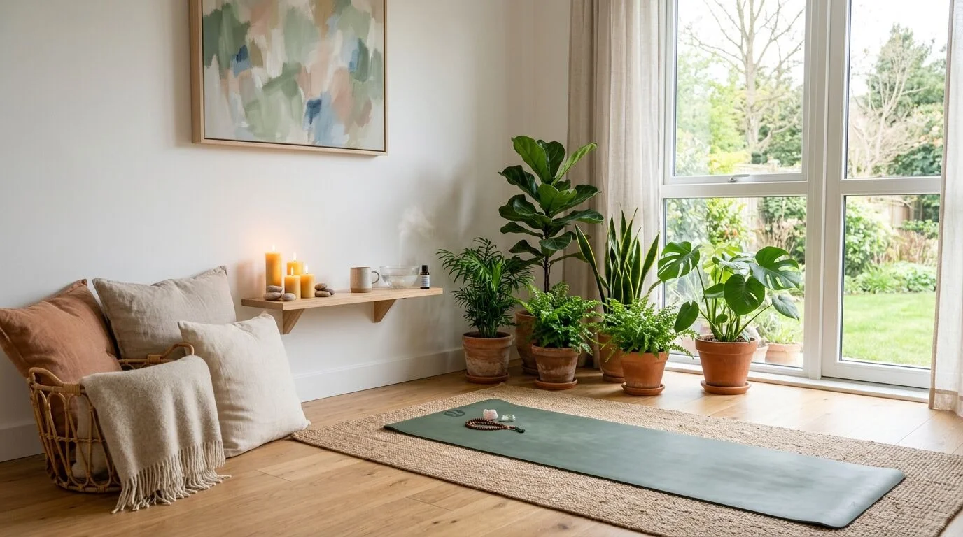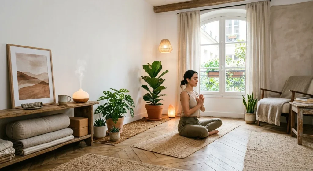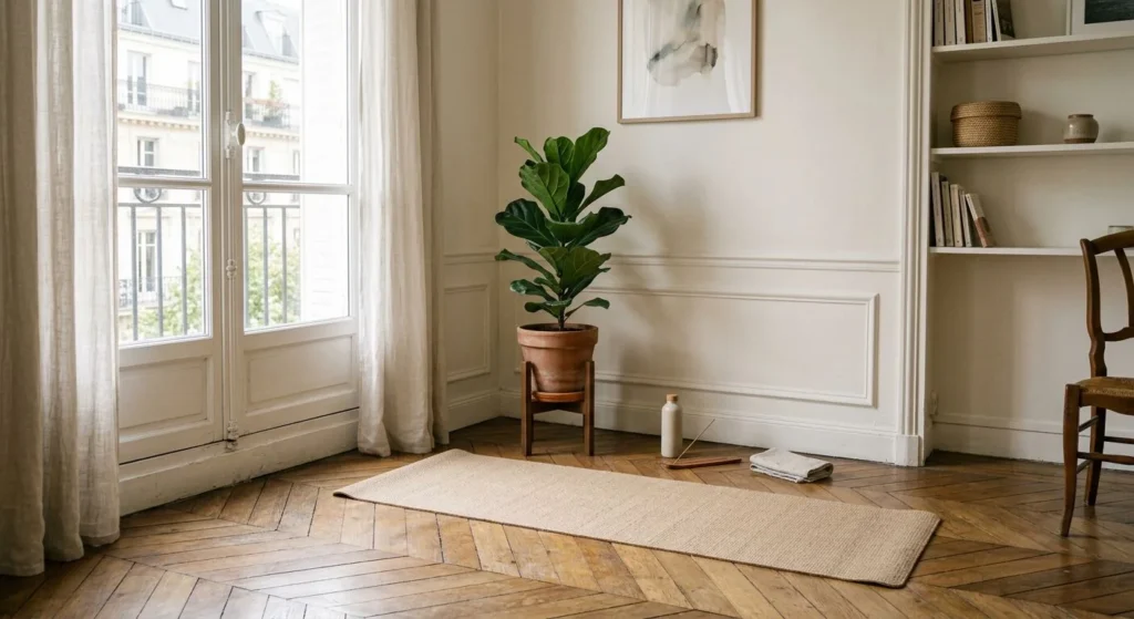 Même un angle de chambre ou de salon, bien délimité visuellement, devient un coin yoga fonctionnel. L’important est de le garder dégagé et de donner au tapis une place fixe, visible.