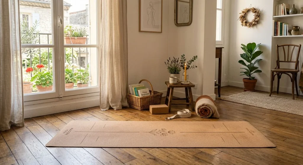 Pas besoin d’une pièce dédiée ni de 15 m². Un coin yoga qui fonctionne tient dans un angle de salon ou un bout de chambre, à condition que ce soit le bon angle, avec le bon sol. Ce qui fait qu’on y revient régulièrement, c’est rarement la déco : c’est l’espace libre, le silence relatif, et un tapis qui ne glisse pas. Le reste vient après.