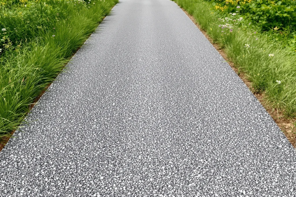La grave concassée reste l’alternative la plus proche en termes de budget. C’est de la pierre brute, sans liant, mais bien compactée elle offre une surface très stable, surtout sur sol drainant. Le résultat est plus minéral, plus naturel visuellement, et il n’y a aucun risque sanitaire. C’est souvent ce qu’on recommande pour les chemins de jardin un peu chic.