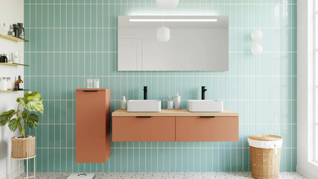 Le terracotta fonctionne bien comme couleur dominante lorsqu’il est utilisé sur un mur principal, un sol ou un carrelage de douche. Le vert intervient alors en complément, sur un meuble vasque, un mur secondaire ou des niches.